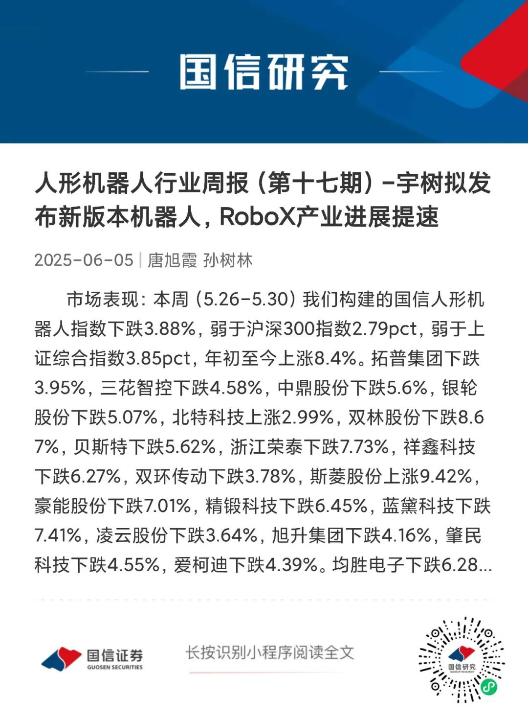 具体报告内容详见国信证券汽车团队于2025年6月5日发布的《人形机器人行业周报(第17期):宇树拟发布新版本机器人,RoboX产业进展提速》