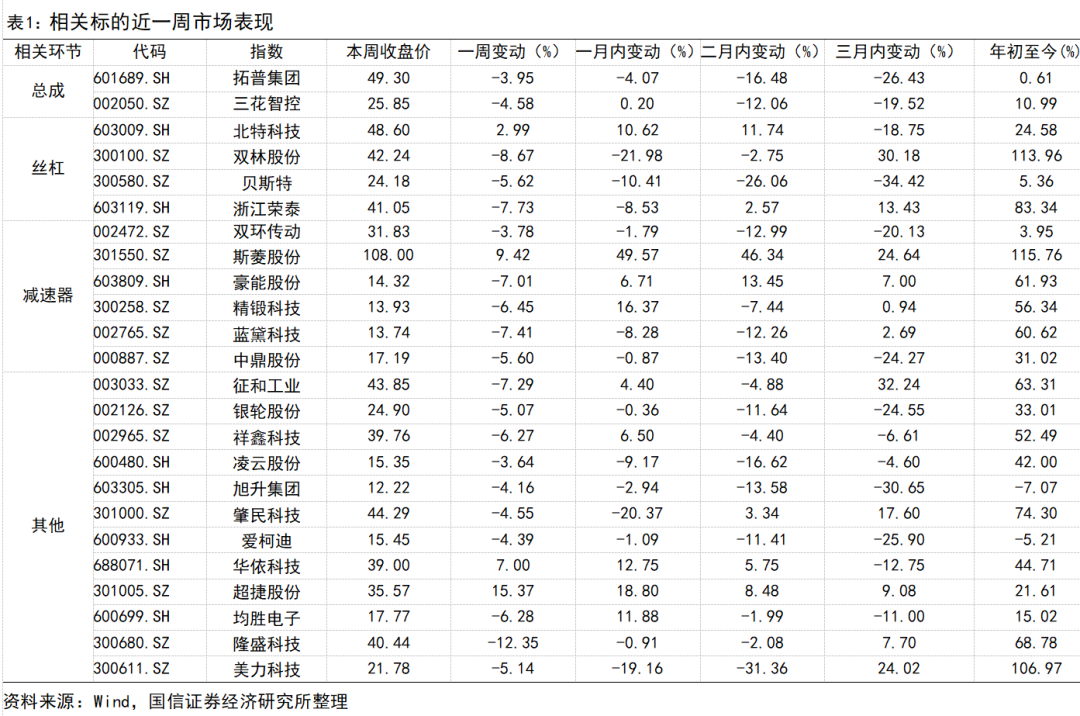 本周(5.26-5.30)我们构建的国信人形机器人指数下跌3.88%,弱于沪深300指数2.79pct,弱于上证综合指数3.85pct,年初至今上涨8.4%。拓普集团下跌3.95%,三花智控下跌4.58%,中鼎股份下跌5.6%,银轮股份下跌5.07%,北特科技上涨2.99%,双林股份下跌8.67%,贝斯特下跌5.62%,浙江荣泰下跌7.73%,祥鑫科技下跌6.27%,双环传动下跌3.78%,斯菱股份上涨9.42%,豪能股份下跌7.01%,精锻科技下跌6.45%,蓝黛科技下跌7.41%,凌云股份下跌3.64%,旭升集团下跌4.16%,肇民科技下跌4.55%,爱柯迪下跌4.39%。均胜电子下跌6.28%。征和工业下跌7.29%,美力科技下跌5.14%。