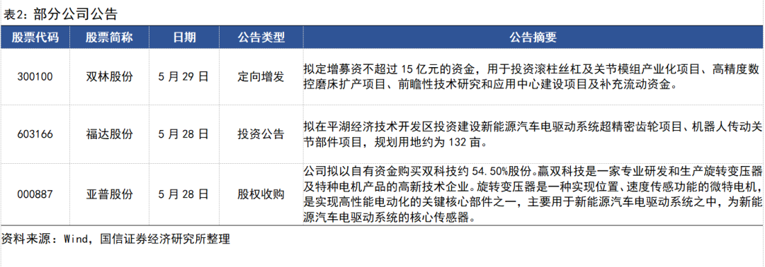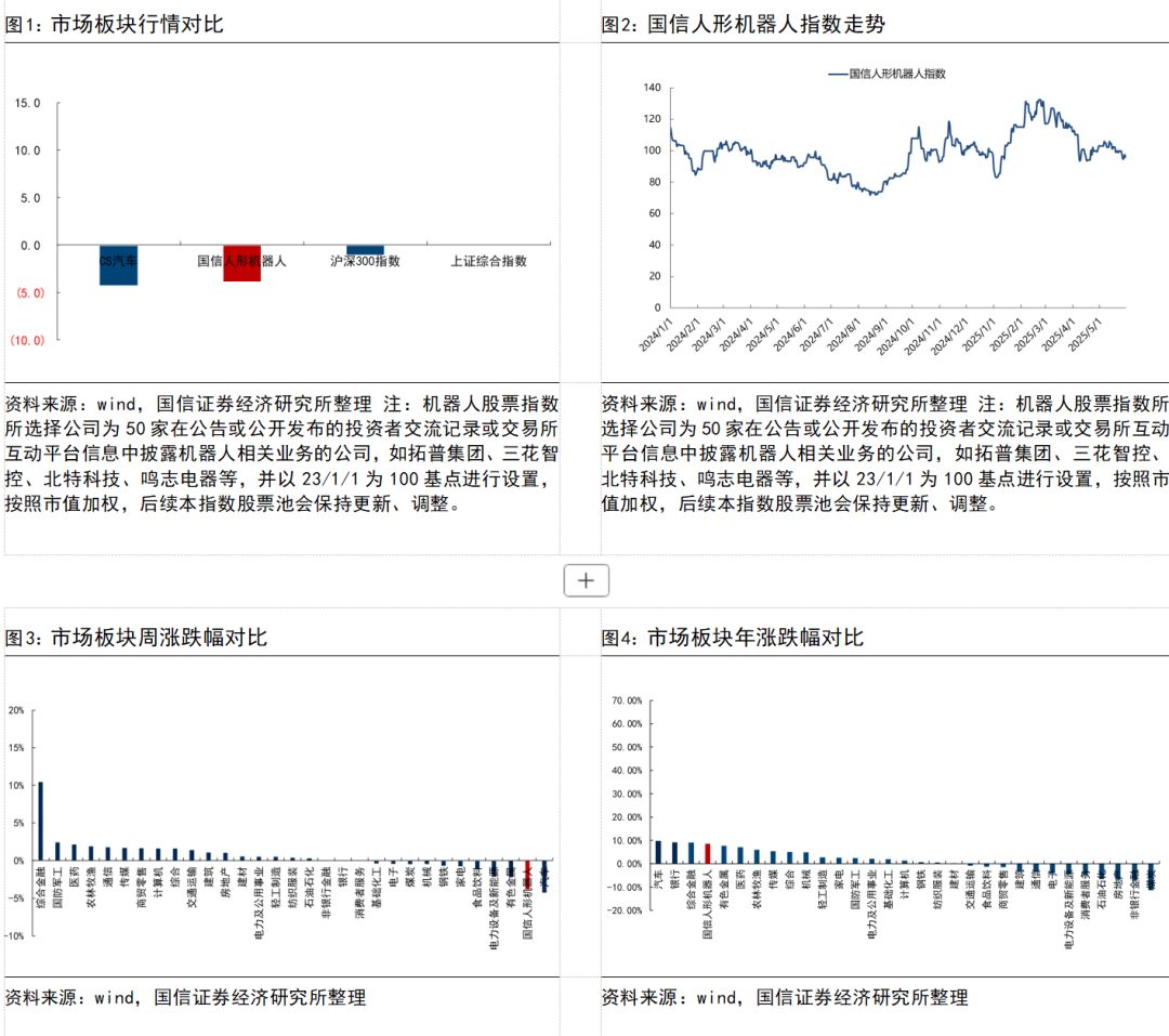 市场表现:本周(5.26-5.30)我们构建的国信人形机器人指数下跌3.88%,弱于沪深300指数2.79pct,弱于上证综合指数3.85pct,年初至今上涨8.4%。拓普集团下跌3.95%,三花智控下跌4.58%,中鼎股份下跌5.6%,银轮股份下跌5.07%,北特科技上涨2.99%,双林股份下跌8.67%,贝斯特下跌5.62%,浙江荣泰下跌7.73%,祥鑫科技下跌6.27%,双环传动下跌3.78%,斯菱股份上涨9.42%,豪能股份(维权)下跌7.01%,精锻科技下跌6.45%,蓝黛科技下跌7.41%,凌云股份下跌3.64%,旭升集团下跌4.16%,肇民科技下跌4.55%,爱柯迪下跌4.39%。均胜电子下跌6.28%。征和工业下跌7.29%,美力科技(维权)下跌5.14%。